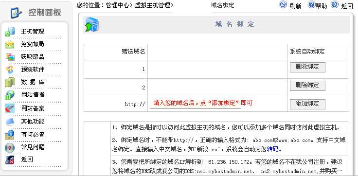 2.在虚拟主机管理中心,点“域名绑定”将该域名绑定到该主机上即可。